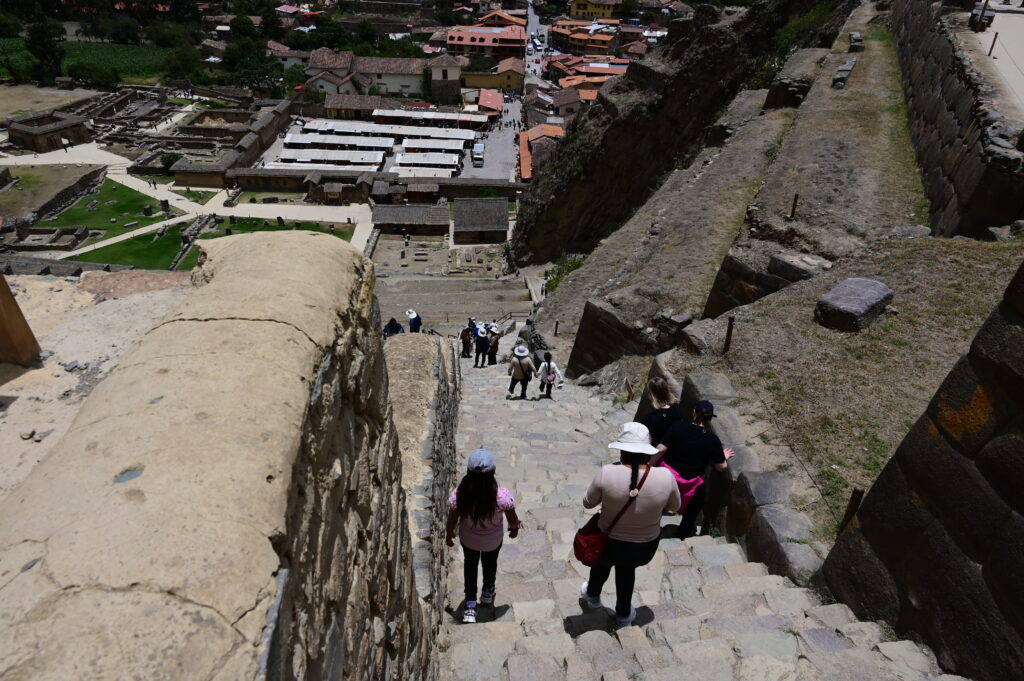 Fra omvisningen inne i selve byen, gikk vi så bortover til inkaruinene. Her er det ruiner ubesudlet av spanjoler eller andre med dårlige hensikter. Ruinene ligger typisk nok i en bratt bakke, og det er mange trappetrinn for å komme seg til topps. Apropos trappetrinn, så bygde man vanligvis ikke tradisjonelle trapper mellom hver terasse i bakkene. I stedet satte de inn lange steiner som stikker ut fra muren, så man gikk opp langs muren.