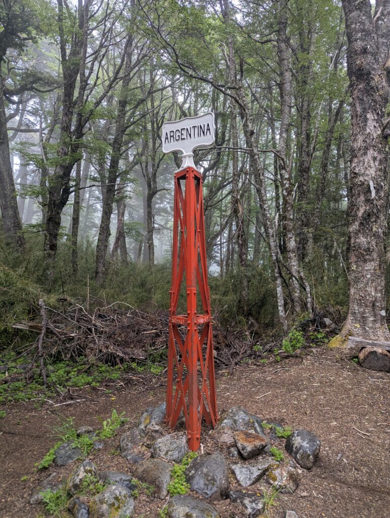 Fra Petrohue ble det båt i sakte tempo nesten 2 timer over innsjøen Lago Todos Los Santos, som oversatt blir noe sånt som Allehelgenssjøen, til Peulla helt i østenden. Her ligger det et hotell og spisested ca 5 minutts kjøretur fra havnen. Vi hadde lunsj bestilt, så da ble det 3-retter (igjen) med dagens suppe, falafel (kunne valgt kjøttretter) og karamell-pudding til dessert. Etter lunsj var det tid for å forlate Chile. Det var ikke lange biten å kjøre. Alle ble kommandert inn i bussen, den gjorde en U-sving og kjørte 50 meter, og der var vi. Etter å ha levert PDI-skjemaet vi fikk ved innreise, og få stempel i passet var alle godkjent for utreise, og bussen med oss, og mange andre ombord, kunne sette nesen i retning grensen til Argentina. Veien var så-som-så hele veien. Det var vel sånn ca Dålåveien både i bredde og kvalitet, der møtested mellom bussene som trafikkerte veien ble avtalt over radio underveis. Det gikk mot bakk opp gjennom en smal, svingete og uoversiktlig vei helt til vi nådde toppen, og der var sannelig grensen til Argentina. Full stopp, ut å ta bilder av grensestolpen som sto noen meter fra veien, før vi startet på unnabakkene.