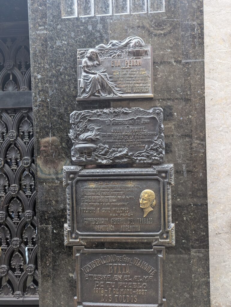 Man kommer ikke utenom Eva Peron når man er i Buenos Aires. På gårkveldens tangoshow var det eget innslag der de sang «Don’t cry for me, Argentina», og bilder eller figurer av henne ser vi flere steder. Hun døde av kreft, 33 år gammel, og er gravlagt på kirkegården La Recoleta. La Recoleta brukes mest for de store og kjente, men har man mer enn nok penger og er villig til å bruke dem er det fortsatt mulig å kjøpe seg en plass her. Hele kirkegården er full av mausoleer med alle slags utsmykninger. Her ligger Eva gravlagt sammen med flere av familiemedlemmene fra Duarte-slekten som hun kom fra.