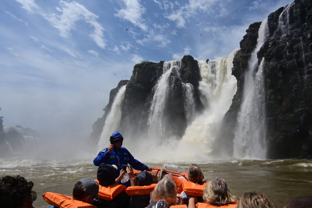 Etter å ha gått turen langs fossene, var det tid for litt mer nærkontakt nedenfra. Så neste punkt på lista var det båttur langs elven oppover mot fossene, og ikke minst, inn i et par av dem. En skikkelig våt opplevelse, kan man trygt si.